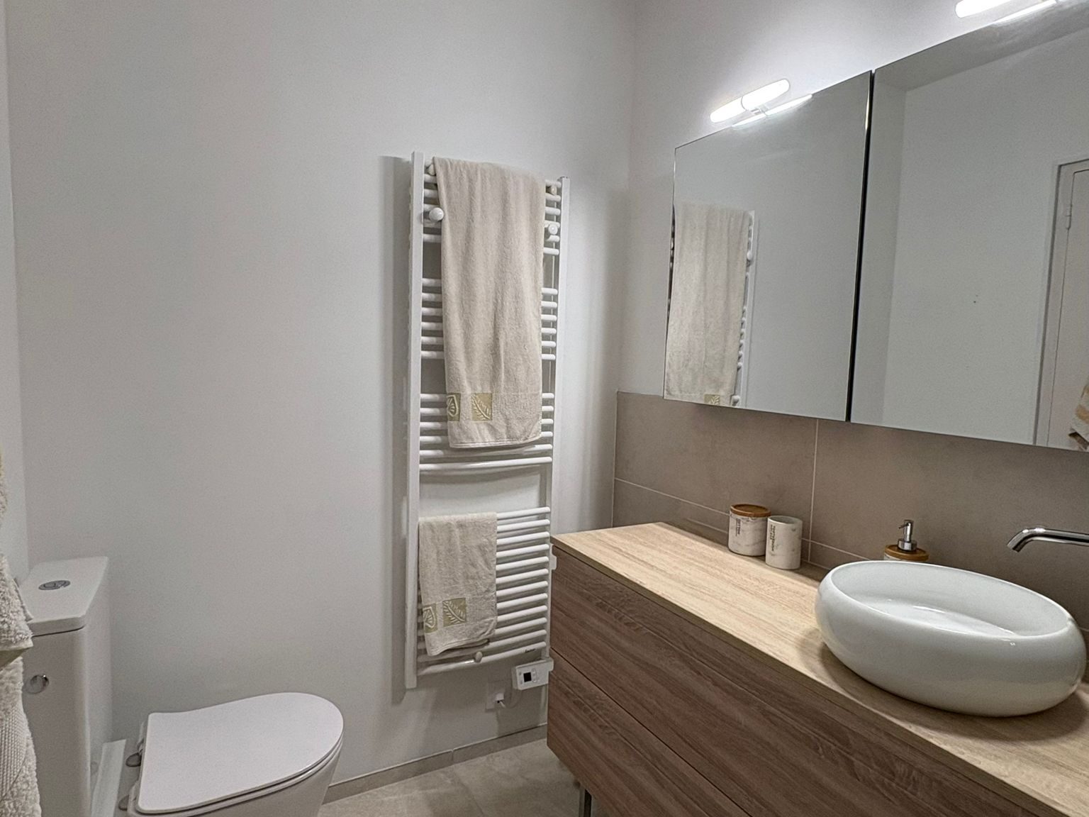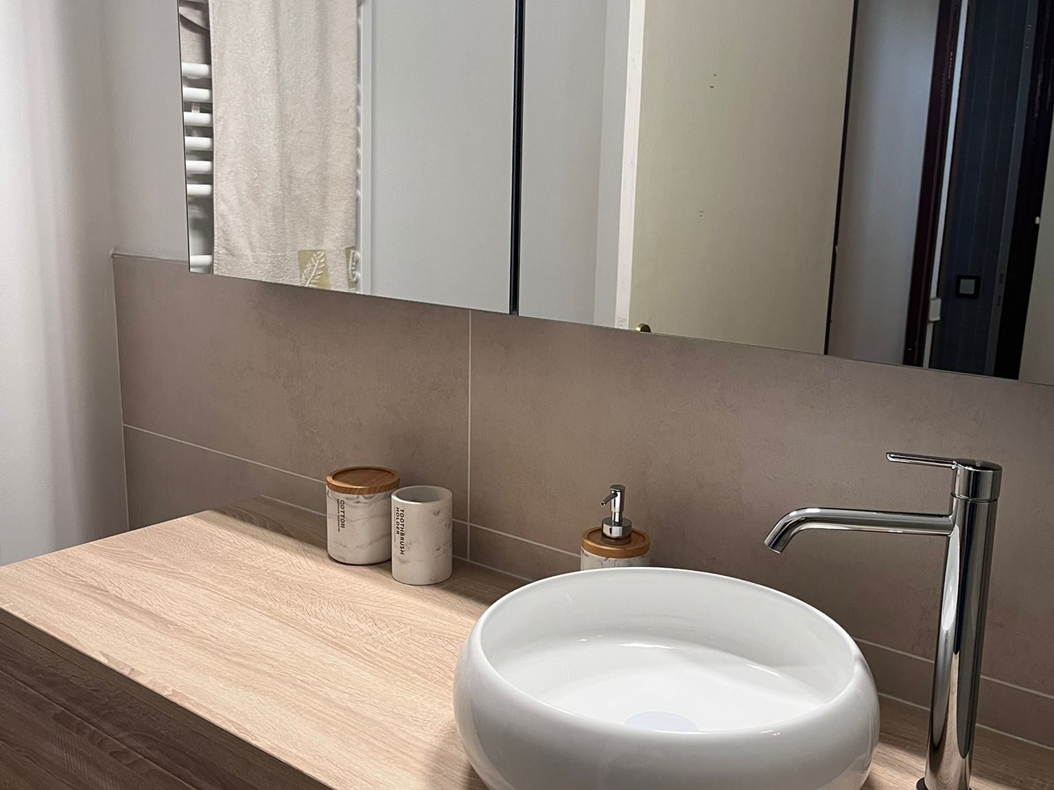 Le mobilier choisi valorise à la fois design et praticité, avec une vasque contemporaine posée sur un généreux plan de travail et deux placards éclairés qui apportent esthétique et confort au quotidien.